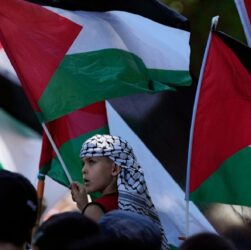 Un jeune garçon brandit son drapeau au milieu d’une foule rassemblée dans le centre de Sydney le dimanche 15 octobre 2023 …