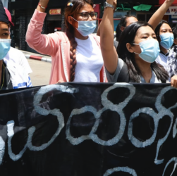 Image: Des manifestants opposés au coup d’État font le salut de défi à trois doigts et scandent des slogans en …
