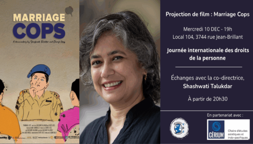 À l’occasion de la journée internationale des droits de la personne, rejoignez nous mercredi 10 décembre à 19h pour la projection du film Marriage Cops, suivi d’un échange avec la co-directice et monteuse du film Shashwati Talukdar !