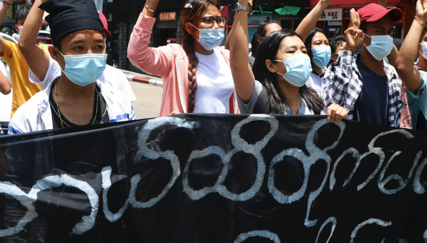 Image: Des manifestants opposés au coup d’État font le salut de défi à trois doigts et scandent des slogans en brandissant des banderoles sur lesquelles on peut lire : « La grève de Kamayut se poursuivra jusqu’à la victoire » à Yangon, le 3 mai 2021. (© Photo AP)