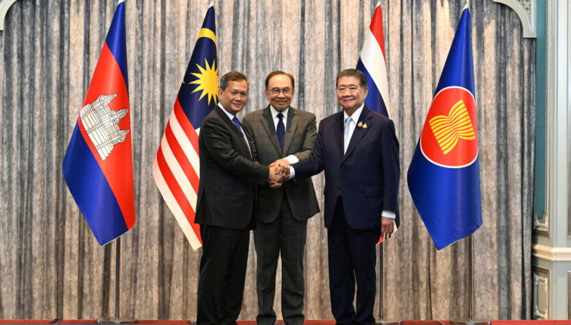 Le premier ministre cambodgien, Hun Manet, le premier ministre malaisien, Anwar Ibrahim, et le premier ministre thaïlandais par intérim, Phumtham Wechayachai. (© MOHD RASFAN, ASSOCIATED PRESS).