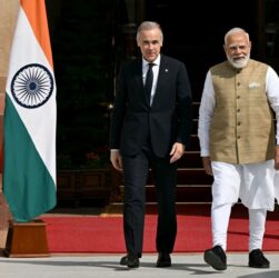 Le premier ministre du Canada, Mark Carney, et son homologue indien, Narendra Modi, devant l’Hyderabad House, à New Delhi, lundi …
