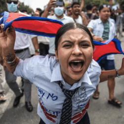 Une manifestante crie des slogans lors d’une manifestation devant le parlement à Katmandou, le 8 septembre 2025, condamnant l’interdiction des …