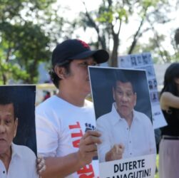 Image:  Des militants brandissent des photos de l’ancien président philippin Rodrigo Duterte lors d’un rassemblement, avant de regarder la retransmission …