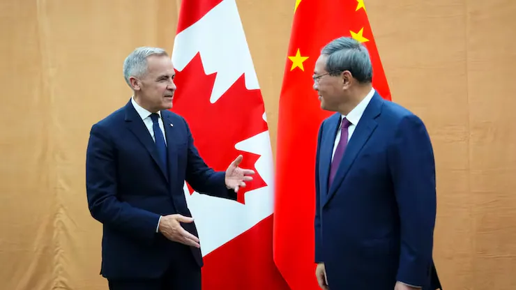 Le premier ministre du Canada, Mark Carney, a rencontré le premier ministre chinois Li Qiang, le 23 septembre 2025, à New York  (© LA PRESSE CANADIENNE / SEAN KILPATRICK ).