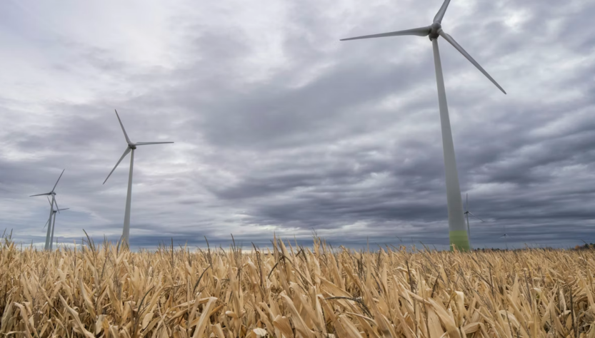 Image:  Le parc éolien Kémont sur la Rive-Sud de Montréal, mis en service en 2012, comprend 44 éoliennes d’une capacité installée de 100 MW, achetée par Hydro-Québec. (© La Presse canadienne/Christinne Musch )