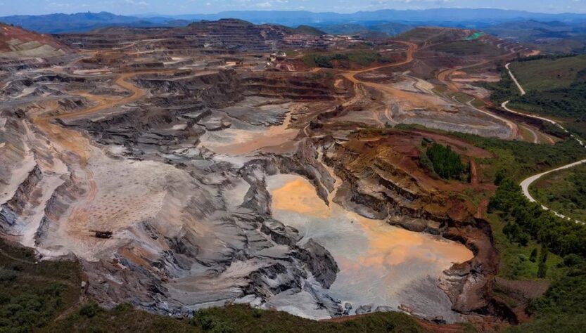 Vue aérienne de la mine de fer d’Alto Bandeira au Brésil. Le cuivre, le fer, l’aluminium, le zinc, le plomb et le nickel représentent ensemble 98 % de tous les métaux extraits. (© M.PIMENTEL/GETTY ).